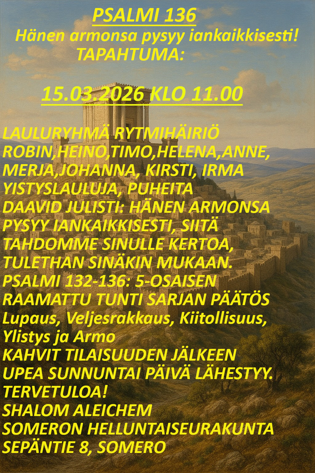 SOMERON HELLUNTAISEURAKUNNASSA ALOITAMME KLO 18.00 HYVÄN SANOMAN-ILLAT, JOISSA LAULUJA, RUKOUSTA JA PUHE.
